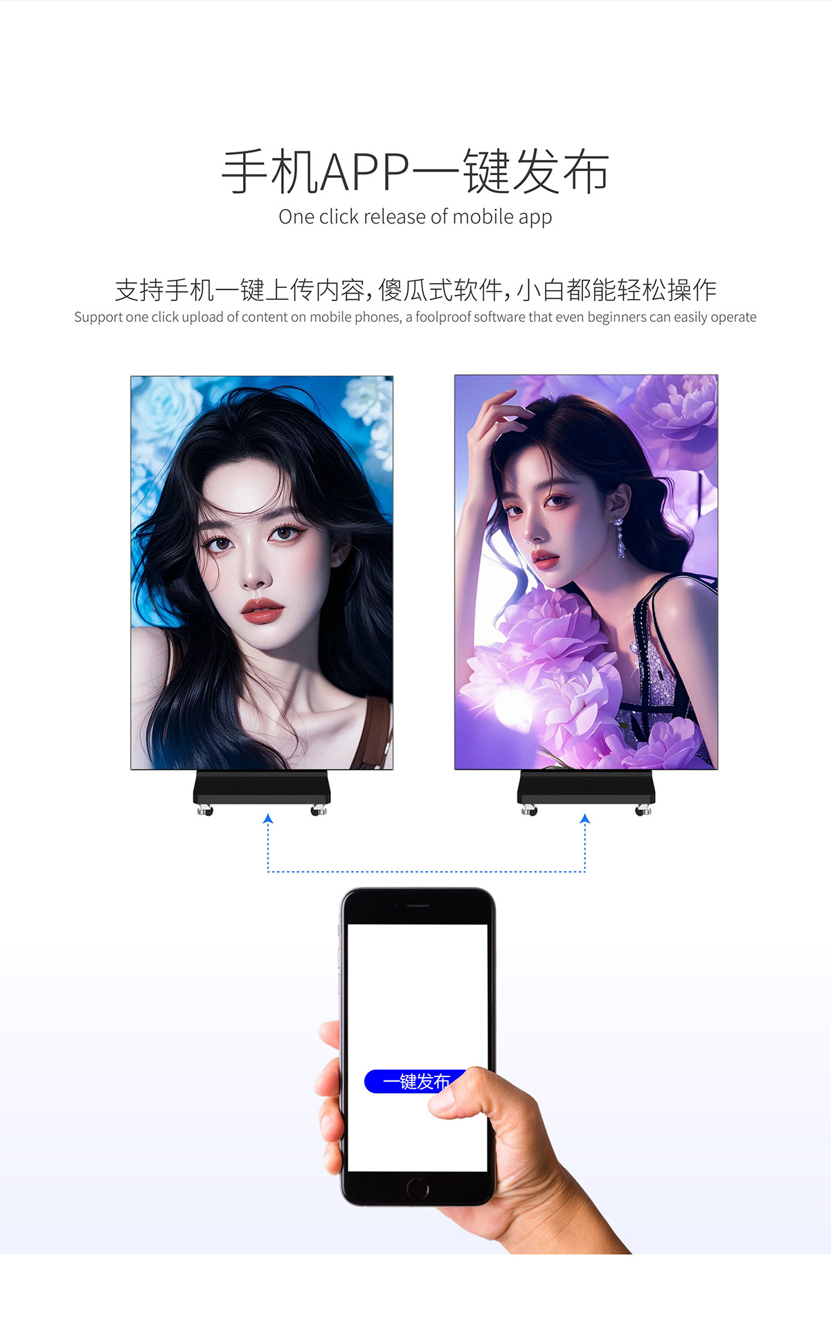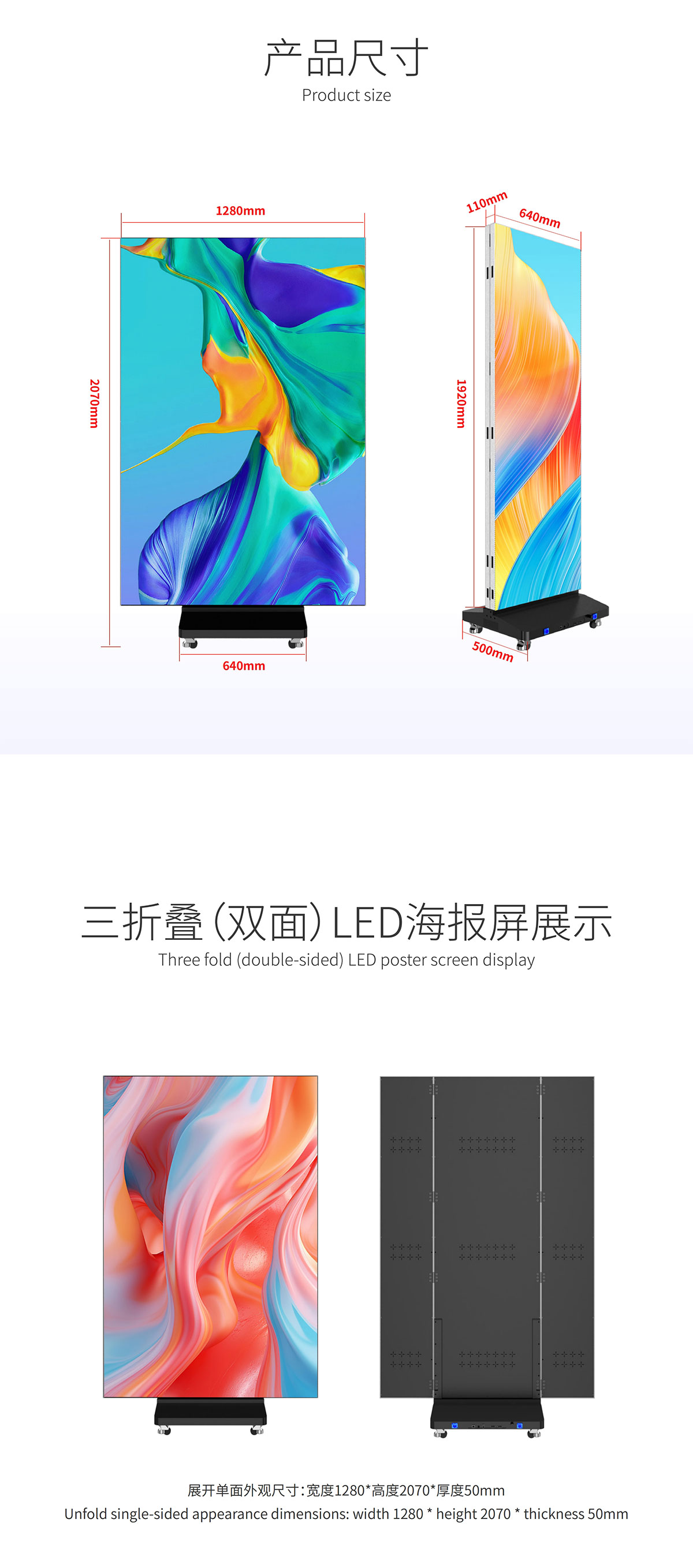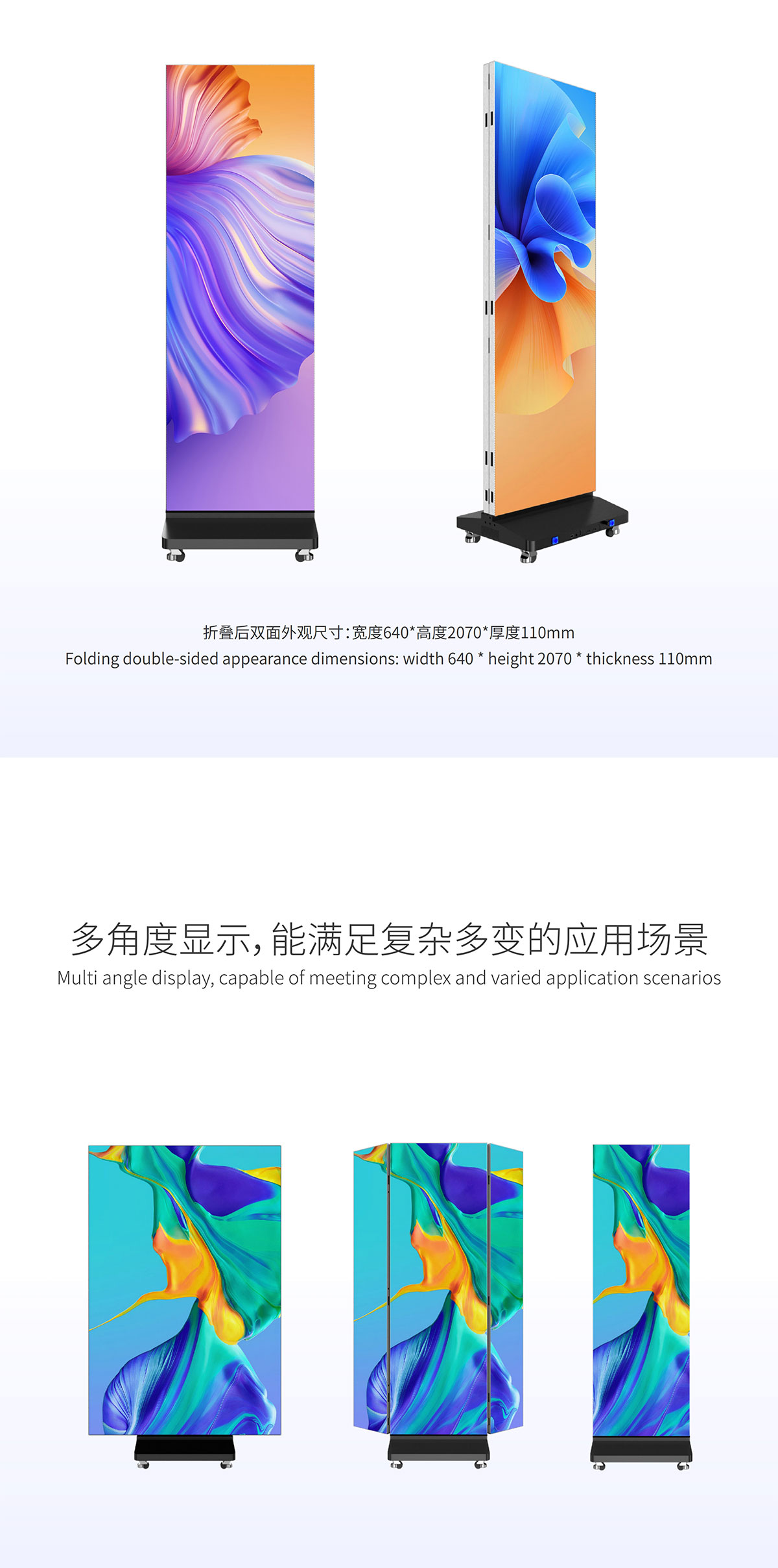拥有20年的行业经验,始终以用户为中心,通过大量的用户反馈和市场调研,深度挖掘并解决用户在LED显示屏使用中的痛点问题。例如,针对传统LED显示屏安装难、程序调试复杂、不便运输等难点,我司在024年率先推出了折叠式LED电子海报屏,赢得了用户及业界的高度认可。2025年3月又推出了”三折叠(双面)LED移动海报屏,2025年3月第一次在深圳福永ISLE展会上亮相,获得了不少用户的高度关注。